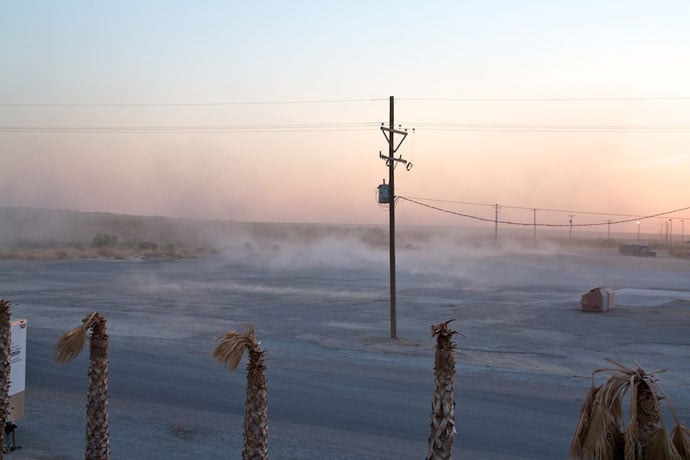 Efter en varm eftermiddag med lækre biler to vinden til henunder solnedgang. Fordi det er ørkenområde og det ikke har regnet i lang tid (siden oktober flere steder) så er landskabet eroderet flere steder og lidt blæst skaber hurtigt støvstorme. Lige uden for hotellet så det sådan ud og ned gennem byen ramte man flere af disse når man kørte rundt.