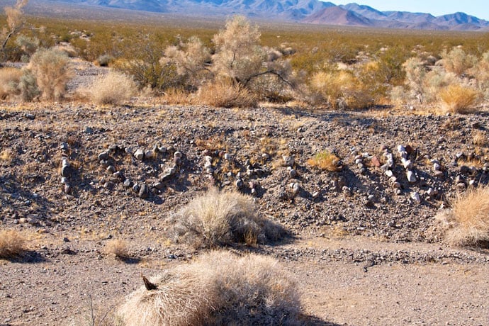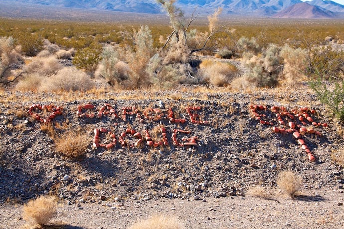 Langs strækningen et stykke inde i den højre vejkant, var der over flere kilometer skrevet hilsner med sten. Ved ikke om det er en gammel Route 66 tradition eller noget der er kommet til senere. Vi så nogle enkelte som var i gang med at efterlade deres hilsen. Vi sprang dog denne aktivitet over. Der var over 40 grader og stenene var skoldhede at håndtere. Vi kiggede i stedet frem mod vores store stop på strækningen, nemlig Amboy Crater.