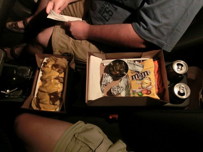 Vi havde sprunget aftensmaden over så vi nuppede en solod biograf menu bestående af hotdogs og nachos. Det brede armlæn i bilen blev fyldt op med mad og snacks og radioen blev indstilliet på 101,2 så vi kunne høre lyden.