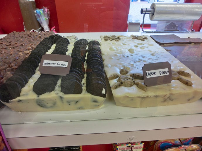 Vi gik en tur ad “strøget” hvor butikker og cafeer så småt var ved at vågne. Vi blev fanget af en farverig slikbutik hvor deres speciale var karameller (taft). Fristet af de mange varianter fyldte vi en pose med banana cream pie, mango chili, rootbeer, bubblegum m.fl. Det blev ikke til noget fudge i denne omgang, men lur mig om ikke det sker senere på turen.