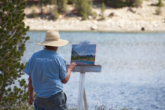 Der var en enkelt campist på pladsen som stod i ved bredden og malede udsigten.