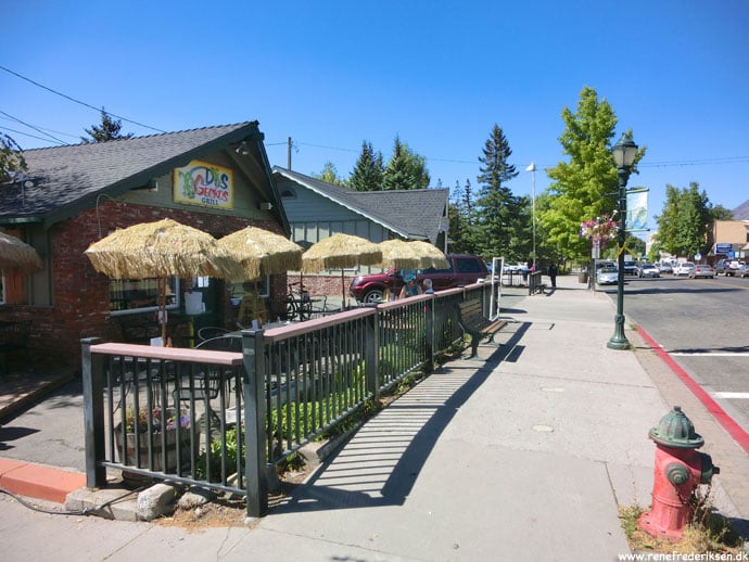 Vi ankom til byen Mt. Shasta omkring frokost. Vi indtog den lille, hyggelige ´downtown´ og fandt en hyggelig lille snask med udeservering – med kig til bjerget.
