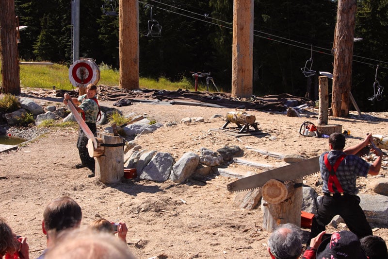 Det er to skovhuggere, som konkurrerer i klassiske discipliner som øksekast, savning or log roll.