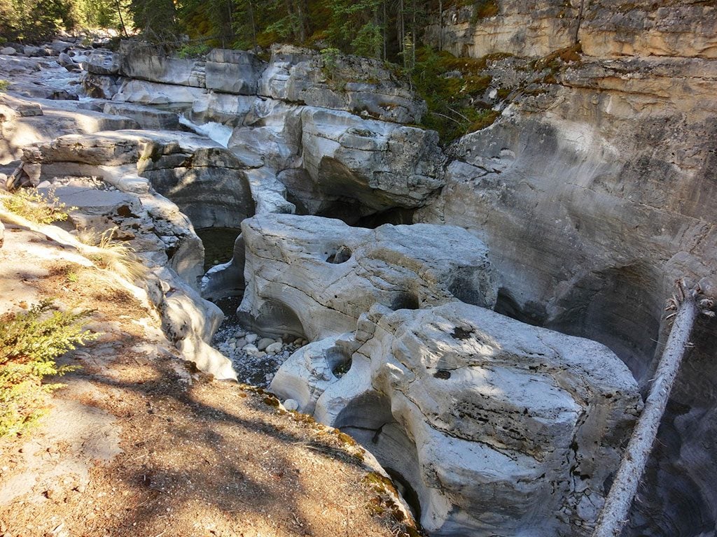 Ved Maligne Canyon kan du i et lille område se næremere på den finurlige geologiske sammensætning der er i området. Der var ikke så meget vand da vi var der, men nede i kløfter og slugter kan du se floden og vandfald.
