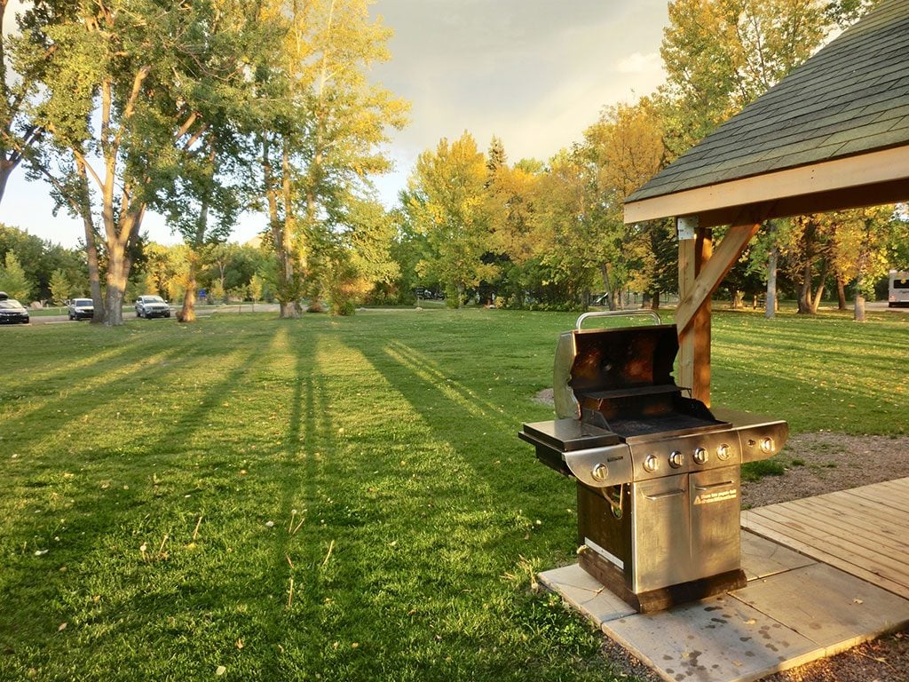 Udenfor stod en lille gasgril klar, hvor der blev stegt lidt pølser og kød på grillen. Købt ved Drumheller og opbevaret i køletasken, sammen med lidt condiments og grønt.