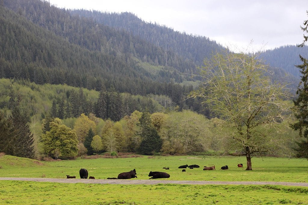 På vej ud af Hoh Rain Forest ligger et lille stykke idyl med gammelt stakit, stensamlinger og køer. Det ligger ved noget af det eneste civilisation på strækningen – Peak 6 Tours & Gift Shop.