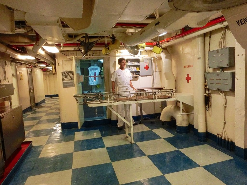 Nede i skibet kan du komme rundt og se hvordan livet var for de 4500 sømænd der var ombord, da skibet var aktiv.