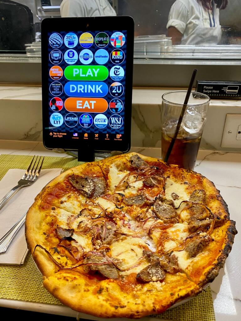 Den ekstra tid i lufthavnen, betød der var tid til at nyde lidt aftensmad. I Newark lufthavn havde næsten alle restauranter installeret tablets til bestilling og betaling. En smart løsning, der betød, du kunne sidde et stykke væk fra restauranten og stadig bestille på de tablets der var næsten alle steder. Det fungerede fint, men det har selvfølgelig sine udfordringer, da rigtig mange grisede fingre kommer i kontakt med skærmen. Kan ikke forestille mig de har været optimale siden marts 2020.