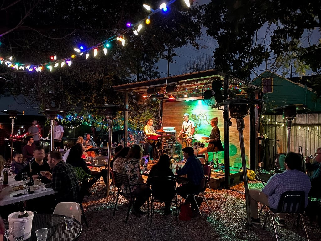 Når du går ind i Bacchanal Fine Wine & Spirits starter du i en vinbutik. Her kan du købe en flaske med hjem, men du kan også købe en flaske for at drikke på stedet. Bacchanal Fine Wine & Spirits er større end det ser ud til. Ude bagved er en stor have med en lille scene. Her er der live musik og denne aften var det jazz.