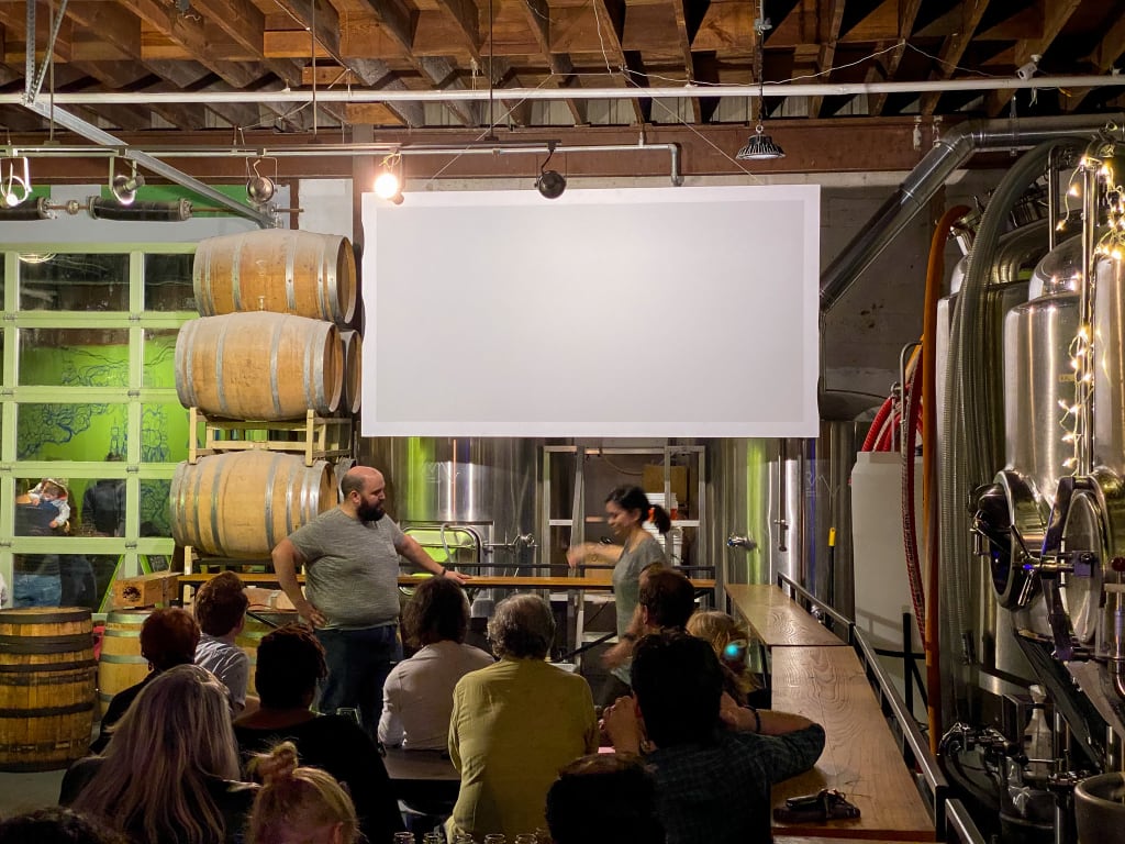 Lokalet og gårdhaven ude bag ved, bruges til diverse events som musik, yoga, meet-ups og comedy. Denne aften var der Improv Comedy indenfor.