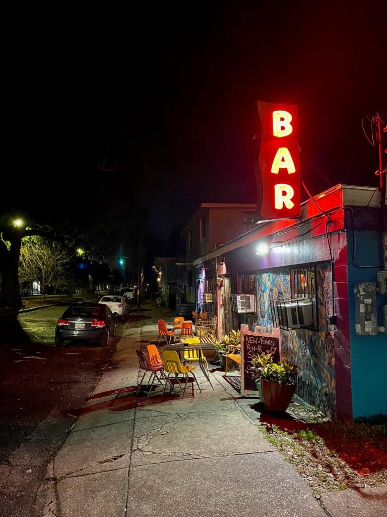Bywater området har flere indbydende stop. Det er et beboelsesområde, så der er ikke en bar på hvert gadehjørne, men nok til at et besøg i området er tiden værd, hvis du vil have en lokal NOLA oplevelse. Et af de mere kendte steder i området er Vaughan’s (billedet med bliktaget). Stedet er kendt for god musik, men denne aften var der kun et par gæster der sad og så noget college football.