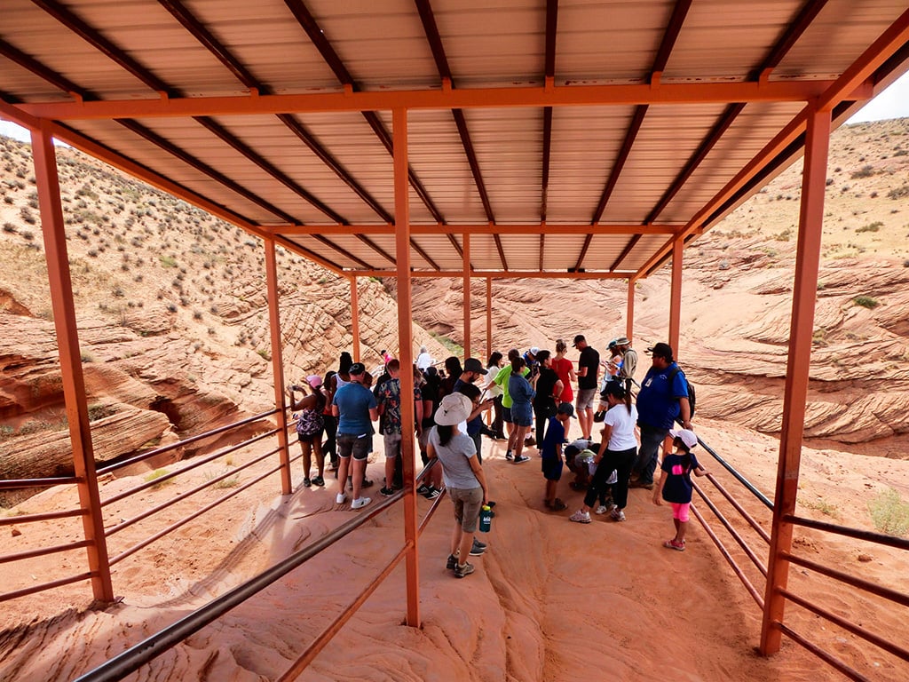 En tour i Lower Antelope Canyon kan være en kompakt oplevelse – især på en dag med mange mennesker. I små hold, anført af en guide, ledes du ned i kløften via en trappe, der er en kende stejl noget af vejen (Lower Antelope Canyon er ikke velegnet til folk i kørestole eller er gangbesværede).