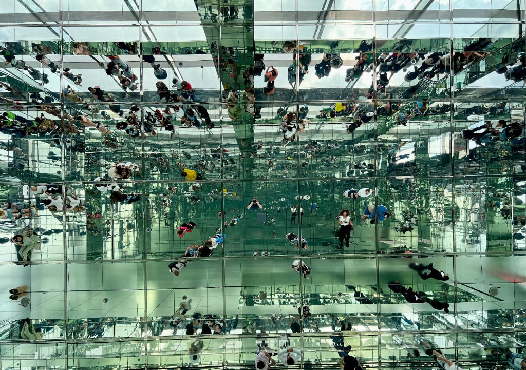 Men dine sko er beskyttet af en årsag. Du står nemlig i et kæmpe rum med spejle på alle overflader, undtagen vinduerne ud til. Det giver en helt speciel oplevelse. Ikke kun den hurlumhej-agtige oplevelse, men også spejlingen af udsigten.